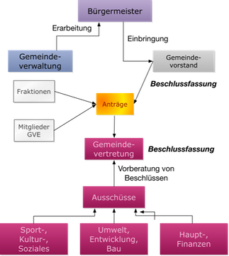 - Der Gemeindevorstand (in der Regel auf Basis von Vorlagen, die die Gemeindeverwaltung erarbeitet hat, oder auf Vorschläge des Bürgermeisters);