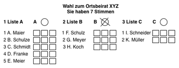 Enthält die Liste weniger Kandidaten als Sitze zu vergeben sind - im Beispiel enthalten alle Listen jeweils weniger als 7 Kandidaten -, so werden die übriggebliebenen Stimmen von oben nach unten als zweite und ggf. als dritte Stimme vergeben, bis alle Stimmen vergeben sind. Im Beispiel oben würden daher bei einem Listenkreuz für Liste B alle drei Kandidaten der Liste 2 zunächst jeweils zwei Stimmen erhalten (damit werden bei drei Kandidaten sechs der sieben Stimmen "verbraucht”). Anschließend entfällt auf Position 1 der Liste die letzte weitere Stimme.